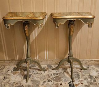Elegante coppia di comodini in stile classico, perfetti per aggiungere un tocco di raffinatezza a qualsiasi ambiente. - Piano in stile marmo con venature. - Struttura in legno dipinto. - Dettagli dorati e intagli. - Gambe a treppiede. Da abbinare volendo al letto matrimoniale in stile classico (anch'esso in vendita). Ritiro a Bologna