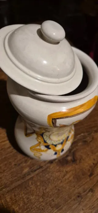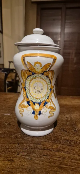 Elegante vaso in ceramica con decorazioni dipinte a mano. - Design a clessidra. - Motivo centrale con angeli e simbolo religioso. - Finitura lucida.