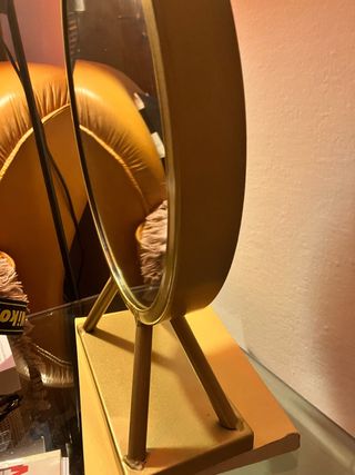 Elegante specchio da appoggio con una finitura dorata che aggiunge un tocco vintage e luminosità 35a qualsiasi spazio. La sua forma rotonda lo rende un pezzo decorativo e funzionale. - Design rotondo - Base stabile