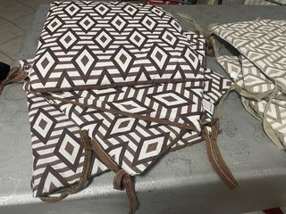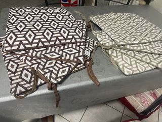 Set di cuscini per sedie con una fantasia geometrica moderna. Aggiungono un tocco di stile alla tua casa. - Fantasia geometrica nei toni del marrone e beige. - Realizzati in tessuto resistente. - Dotati di lacci per fissarli alla sedia.