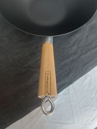 Vendo questa padella wok del marchio Typhoon. È di colore nero ed è realizzata in metallo. Manico removibile. - Manico in legno. - Diametro ampio di cm 30