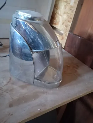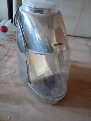 Tritaghiaccio dal design moderno, con finiture argentate e dettagli trasparenti. - Corpo principale in metallo lucido. - Contenitore trasparente in plastica resistente. - Coperchio superiore in plastica trasparente.