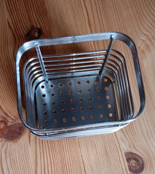Elegante portaposate in acciaio inossidabile, perfetto per organizzare la tua cucina. - Finitura lucida. - Base forata per un rapido drenaggio. Design moderno ed elegante, gommini sul fondo. Alt cm 10, larghezza 10 x 8
