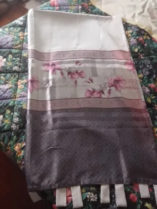 Elegante coppia di tende con un delicato motivo floreale. - Design con fiori rosa e dettagli bianchi. - Realizzate in tessuto poliestere.