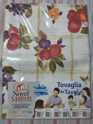 Tovaglia antimacchia con un allegro disegno di frutta. Tovaglia quadrata, no stiro. Sigillata. - Design con uva, mele e arance. - Ideale per la tavola di tutti i giorni.
