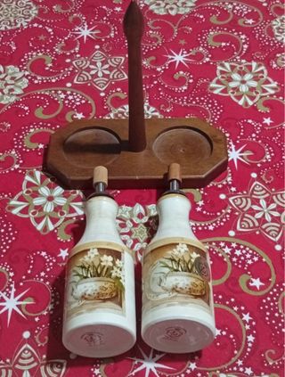 Porta Olio e Aceto in Ceramica con Base Legno