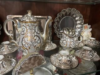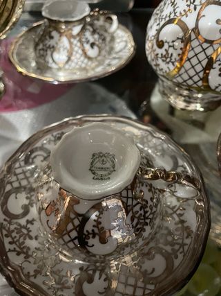 Elegante juego de café Verbano Laveno con un diseño intrincado. - Piezas de porcelana con detalles dorados. - Incluye cafetera, lechera y tazas con sus platillos. - Elementos metálicos decorativos y de soporte.