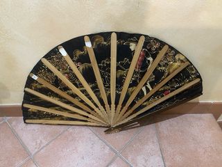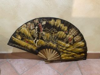 Bellissimo ventaglio decorativo con un'elegante stampa. - Realizzato in tessuto e legno. - Colori predominanti nero e oro. - Raffigura una scena tradizionale con figure e paesaggio.