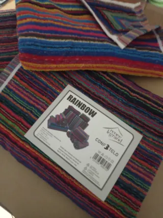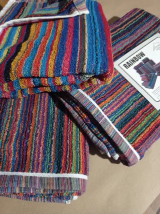 Set di tre teli da bagno in spugna di cotone, caratterizzati da un vivace design a righe multicolore. - Design a righe arcobaleno. - Morbida spugna di cotone.