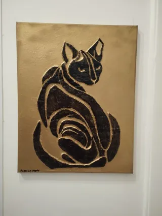 Opera d'arte raffigurante un gatto stilizzato, realizzata con la tecnica dello stucco su tela. - Tecnica: Stucco su tela - Colori: Oro e nero - Soggetto: Gatto 50x40