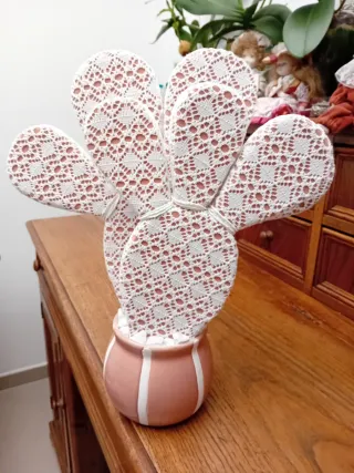 pianta decorativa di fico d'india fatta a mano in pizzo , perfetta per aggiungere un tocco di originalità alla tua casa. - Vaso in ceramica con dettagli a righe. - Cactus realizzati in tessuto con lavorazione a uncinetto.