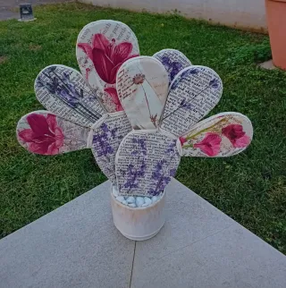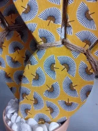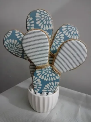 Deliziosa pianta decorativa a forma di cactus, fatta a mano, perfetta per aggiungere un tocco di originalità alla tua casa. - Rivestimento in tessuto con fantasie assortite. - Dettagli rifiniti con corda di juta. - Base in ceramica bianca con sassolini decorativi.