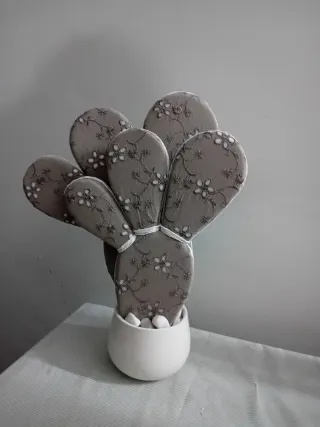 Originale pianta decorativa a forma di pale di fico d'india, fatta a mano, perfetta per aggiungere un tocco di stile alla tua casa. - Rivestimento in tessuto con ricami. - Base in ceramica lavorata.