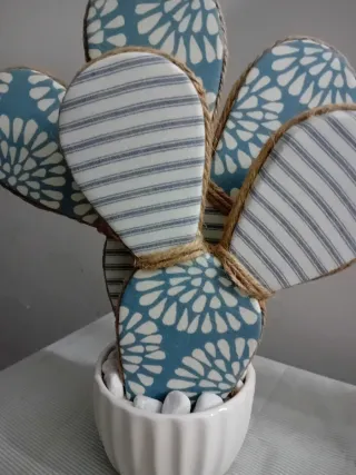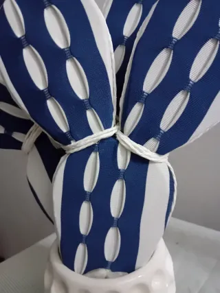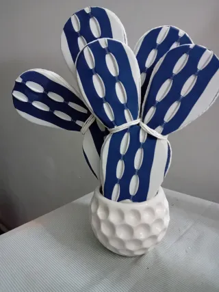 Deliziosa pianta decorativa a forma di cactus, fatta a mano,perfetta per aggiungere un tocco di originalità alla tua casa. - Design a cactus stilizzato. - Finitura con tessuto a righe blu e bianche. - Vaso in ceramica bianca con texture a nido d'ape.