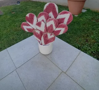 Questa pianta decorativa a forma di pale di fico d'india aggiunge un tocco di colore e originalità a qualsiasi spazio. - Design unico con motivo a zig-zag. - Realizzata a mano con cura . Colore panna e corallo