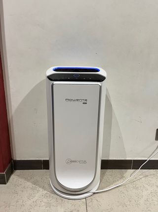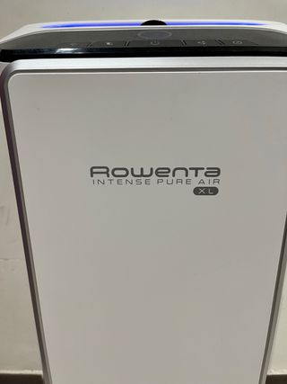 Purificatore d'aria Rowenta Intense Pure Air, un dispositivo elegante e moderno per migliorare la qualità dell'aria in casa. - Design bianco con finiture argentate. - Pannello di controllo superiore con indicatori luminosi.
