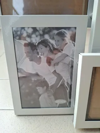 Cornice portafoto sia da tavolo che da parete. Misure 45cm x 30cm Contiene 6 immagini 10x15 come da fotografia Disponibili 3 pezzi (prezzo 3 Euro/cad)