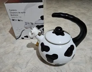 Bollitore a fischio a forma di mucca, in acciaio, bianco e nero. NUOVO Con scatola, un po segnata. Adatto per induzione