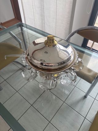 Elegante set per aperitivo e punch, utilizzato per servire bevande calde e fredde, perfetto per ogni occasione. La base in metallo argentato con dettagli dorati sorregge una ciotola in vetro, mestolo in cristallo e 7 bicchieri, il tutto chiuso da un coperchio dello stesso stile della base. Per quanto riguarda i bicchieri dovrebbero essere 8 ma ne manca uno!