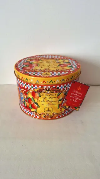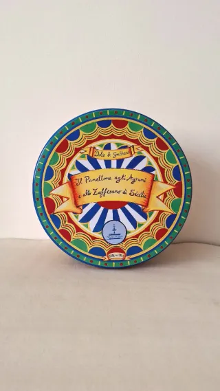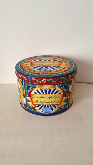 Scatola rotonda in latta da collezione decorata da Dolce & Gabbana. Conteneva un panettone Fiasconaro (non incluso), versione "Panettone agli Agrumi e Zafferano". Ottima da esporre o per conservare biscotti e dolci. Diametro 25 cm, altezza 16,5 cm. #dolcegabbana #dolcegabbana #scatola #latta #panettone #fiasconaro #collezione #design