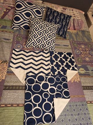 Set Topfinel composto da 3 cuscini e 6 federe in ottime condizioni come da foto. Misura 35x35cm. Include 3 imbottiture e 6 coperture intercambiabili con diverse fantasie geometriche blu navy. Tessuto resistente e cerniere a scomparsa. Perfetti per avere sempre un cambio pronto e un look fresco.