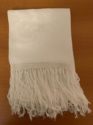 Si tratta di un asciugamano bianco in puro lino realizzato per il corredo di una sposa degli anni '50. Un bordo è finemente ricamato a mano con un ricamo floreale, in un angolo dell'altro bordo è presente il monogramma MT. L'asciugamano, che misura 68x113 cm, è in perfette condizioni, in particolare non presenta nessuna macchia, nemmeno quelle dovute al tempo.