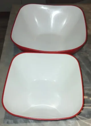 Set di due ciotole da cucina con un design moderno. - Ciotole quadrate con angoli arrotondati. - Bordo esterno rosso. - Interno bianco lucido.