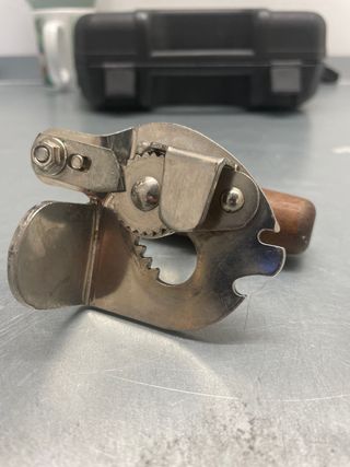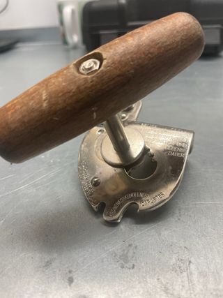 Apriscatole professionale con manico in legno. - Struttura in metallo resistente. - Design classico e funzionale.