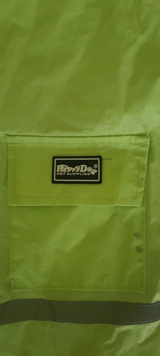 Impermeabile per cani di colore lime, perfetto per le giornate di pioggia. Presenta evidenti segni di usura. Presenta dettagli riflettenti per una maggiore visibilità. - Tasca frontale. - Cappuccio integrato. - Dettagli riflettenti.