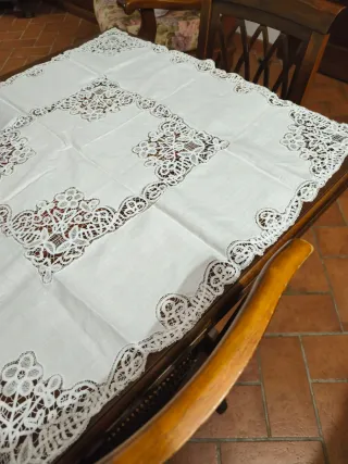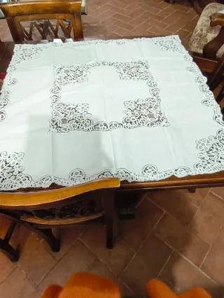 Splendida tovaglietta da thè con dettagli ricamati a mano. Misura 80x80 - Motivo floreale. - Bordi rifiniti con pizzo. - Ideale per occasioni speciali.