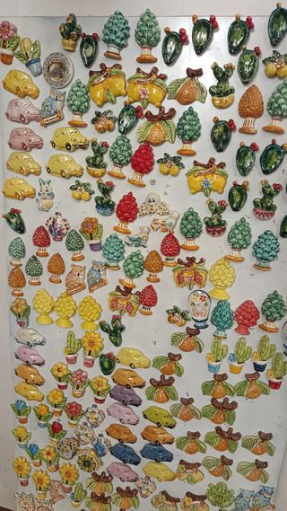 Calamita da appendere. In ceramica decorata a mano.. mix di forme, legate tutte alla tradizione di Caltagirone città della ceramica Ecco una descrizione di come sono fatti: sono realizzati con ceramica di alta qualità. Design: Ogni oggetto è finemente lavorato. le forme sono ispirati dalla ricca tradizione culturale della città di Caltagirone. Montaggio: ogni oggetto ha nella parte posteriore una potente calamita. N.B. possibilità di fare anche delle bomboniere( con eventuale sacchetto) per eventi, matrimoni ecc... con un sovraprezzo solo su ordinazione