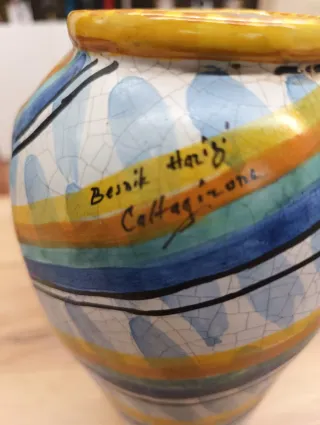 Vaso moderno in ceramica di Caltagirone, altezza 25 cm, presenta un difetto sul bordo dovuto alla sua lavorazione artigianale, lo stesso infatti è unico e non potrebbe essere riprodotto