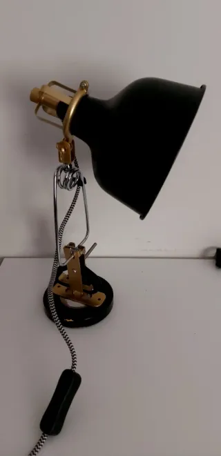 Lampada da tavolo in stile industriale, perfetta per scrivania o comodino. Design elegante e funzionale. - Finitura in metallo nero e dettagli oro. - Braccio flessibile per orientare la luce. - Cavo con interruttore integrato.di può usare sia da tavolo che con la clips