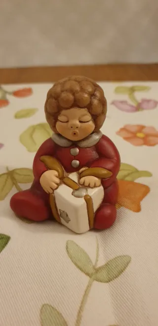 Delizioso personaggio Thun che raffigura una bimba con un pacco regalo. - Realizzato in ceramica. - Dettagli in color argento sul colletto e sui bottoni. - Il bambino indossa un vestito rosso. - Tiene tra le mani un pacco regalo bianco con nastri dorati.