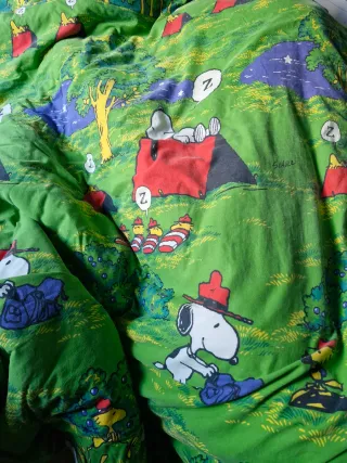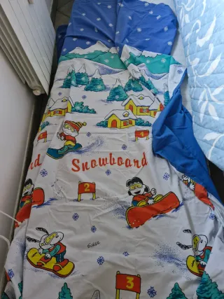 Set di due copripiumoni con divertente stampa a tema snowboard e paesaggi invernali. - Stampa colorata con personaggi Peanuts. - Design con casette, alberi innevati e montagne. - Ideale per camerette. Solo sacco lenzuolo senza federe