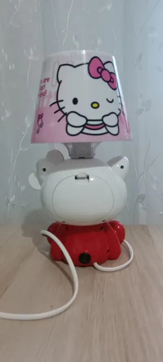 Lampada da notte con design di Hello Kitty, ideale per camerette. Include una sveglia integrata. Caratteristiche: forma di Hello Kitty seduta, schermo con illustrazioni di Hello Kitty e note musicali, base rossa, orologio con lancette e numeri visibili.