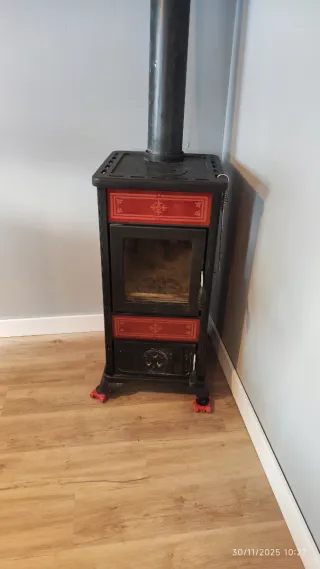 Stufa rustica in ceramica con struttura in acciaio. Focolare in ghisa. Parti anteriore e superiore in ghisa smaltata. Pratici anelli rimovibili per riscaldare i piatti. - 6'8 KW - Ghisa e caolino. Interno in vermiculite. Finitura principale in nero. Dettagli ornamentali in rosso. Una delle ceramiche laterali ha una crepa (visibile in una foto), ma non influisce sul funzionamento. Consegna a Puerto de San Isidro (León)