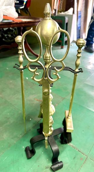 Set di strumenti per camino con supporto e due camini decorativi. Include pala, spazzola, attizzatoio e pinze. Design classico con dettagli dorati. Base e supporti in nero. In ottone originale e design francese, come nuovo.