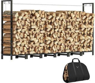 Porta legna esterno in acciaio, con borsa per il trasporto, struttura regolabile e catene in metallo, porta legna rialzato, 0,8 m³, 235x31x116 cm, nero