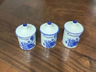 Set di barattoli in porcellana bianca con decorazioni floreali blu, probabilmente destinati a spezie o ingredienti da cucina. Oggetti simili sono spesso realizzati con metodi artigianali e materiali adatti all'uso alimentare. Realizzati in argilla bianca, modellati e rifiniti a mano. Colore smalto bianco antico, decorati a mano. Resistenti alle macchie, lavabili in lavastoviglie e adatti al microonde. Senza piombo. Dimensioni: Altezza 7,00 cm ; Diametro 6,00 cm
