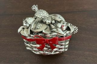Cesto di frutta decorativo, probabilmente un soprammobile, realizzato in metallo e rivestito in argento fiorentino (come indicato da un punzone in immagini simili). Prodotto da Fratelli Magrino nella seconda metà del '900. Presenta una finitura argentata lucida. Decorato con un nastro rosso smaltato. Raffigura un assortimento di frutti in rilievo. Le dimensioni tipiche sono ridotte, ad esempio 9 x 6 x 6 cm.