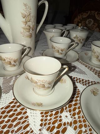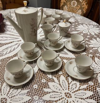 Elegante set da caffè in porcellana, perfetto per ogni occasione. Il design raffinato aggiunge un tocco di classe alla tua tavola. - Include caffettiera, zuccheriera, lattiera e sei tazzine con piattini. - Decorazioni floreali delicate. - Finiture dorate sui manici e sui bordi.