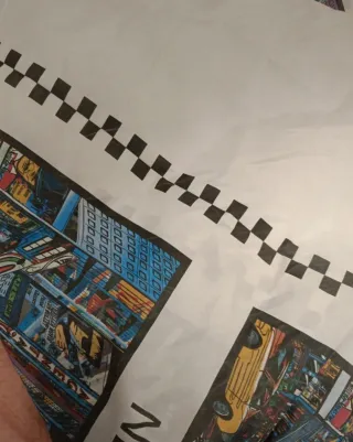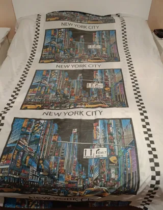 Copripiumino matrimoniale con una vivace stampa di New York City. Il design presenta grattacieli iconici e taxi gialli, tipici della metropoli. - Stampa dettagliata di Times Square. - Bordatura a scacchiera sui lati.
