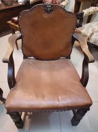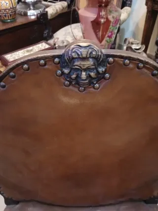 Elegante poltroncina da studio con seduta e schienale in pelle. - Struttura in legno scuro di tovere - Dettaglio decorativo a forma di testa nella parte superiore dello schienale. - Bordatura con borchie metalliche. Misure: 92 cm H - 60 cm L - 46 cm P. Da sistemare l'imbottitura e da concordare le spese di spedizione o consegna