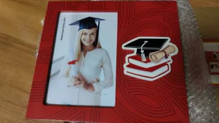 Cornice rossa a tema laurea, con un'illustrazione di un cappello da laureato e una pergamena. Si può spendere o poggiare su un mobile Unico difetto sulla scatola, che aveva già la cancellatura #laurea #cornice #portafoto