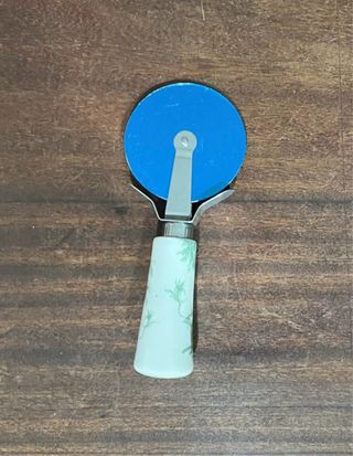 Rotella tagliapizza con manico decorato. L'utensile è dotato di una ruota in metallo con copertura protettiva in plastica blu. Il manico è in ceramica o materiale simile, di colore bianco avorio con decorazioni floreali/a foglie verdi. Dimensioni: L'altezza è di circa 165 mm (16,5 cm).