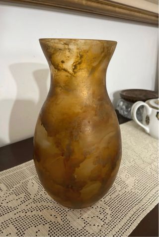Questo vaso in vetro ha un design che ricorda lo stile Art Nouveau, spesso associato ai maestri vetrai come Emile Gallé o oggetti d'arte in vetro di Murano. Materiale e Tecnica: È realizzato in vetro, probabilmente soffiato, con un effetto opalescente o marmorizzato. Presenta macchie bianche e dorate, che potrebbero essere in foglia d'oro o polvere d'oro (spesso 24 carati per i pezzi di Murano). Stile: La forma e la finitura evocano uno stile vintage o d'epoca, con richiami al design italiano di metà secolo o al movimento Art Nouveau, noto per i suoi decori naturali e l'uso di tecniche vetrarie complesse.