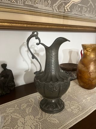 Brocca decorativa in peltro vintage, probabilmente in stile Art Nouveau o Art Déco, con decorazioni in rilievo. Materiale: L'oggetto è realizzato in peltro. Stile: Presenta elementi decorativi in rilievo e un manico elaborato, tipici degli stili di design della fine del XIX o inizio XX secolo. Funzione: Sebbene possa essere utilizzata come vaso o brocca, è principalmente un oggetto da collezione. Condizioni: E’ in ottime condizioni, con una patina naturale dovuta all'età. Dimensioni: Altezza 31 cm