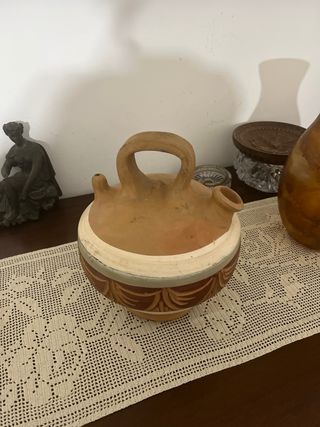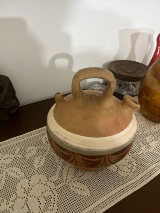 Botijo, tradizionale contenitore in terracotta spagnolo, messicano o di altre culture mediterranee, utilizzato per mantenere l'acqua fresca. È realizzato in argilla o terracotta e presenta un design rustico, spesso artigianale. È caratterizzato da due aperture: una più grande per riempirlo d'acqua e una più piccola (beccuccio) per bere direttamente. Il principio di raffreddamento si basa sull'evaporazione dell'acqua attraverso i pori del materiale, che abbassa la temperatura interna. Questo Botijo ha decorazioni incise e dipinte con fasce bianche e marroni Dimensioni: Altezza 24 cm