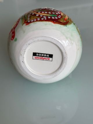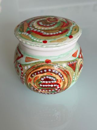 Barattolo in ceramica decorato a mano con un design vivace e colorato. - Pezzo unico fatto a mano. - Motivi a spirale e puntini. - Bordi decorati con dettagli rossi e verdi. -Puó essere utilizzato come barattolo da cucina,porta oggetti , porta gioielli ecc..